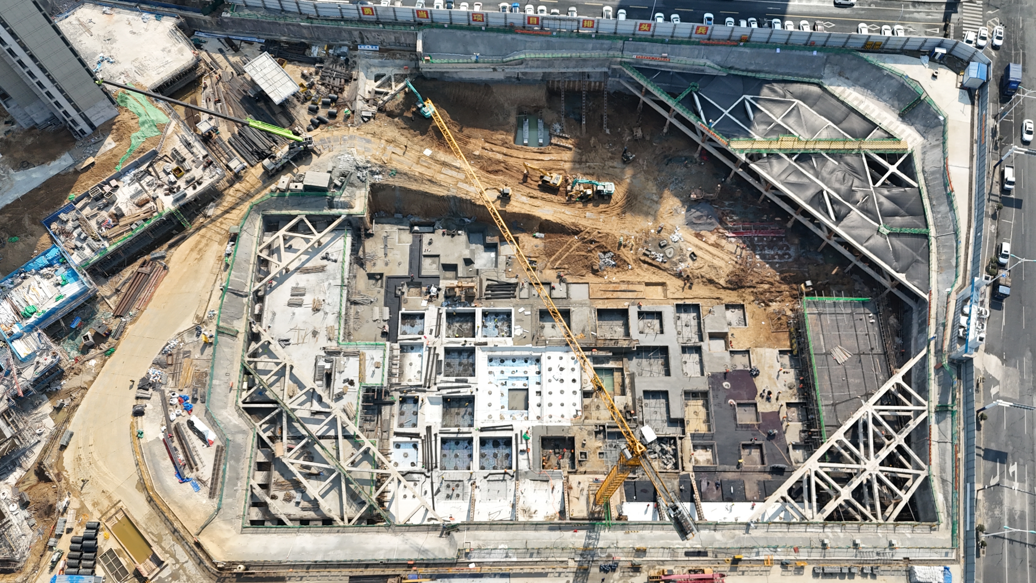 目前,項(xiàng)目正搶抓施工黃金期,組織各分包單位,兩班作業(yè),管理人員全程跟班,共同加緊基礎(chǔ)及地下室結(jié)構(gòu)施工,占地1萬(wàn)平方米的基礎(chǔ)已完成近80%,負(fù)三層地下室已完成近40%,與住宅交界處地庫(kù)已完成近70%。
