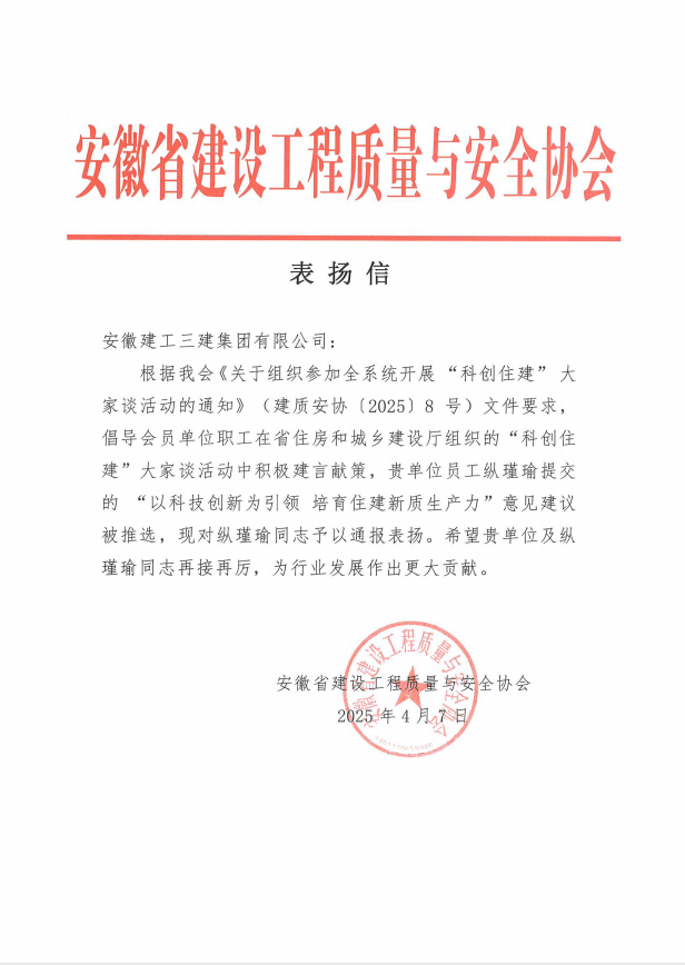 為響應協會號召,安徽建工三建集團積極建言獻策,公司職工黃波提交的《關于發展智能建造和推廣應用建筑機器人的建議》和縱瑾瑜提交的《淺談“以科技創新為引領 培育住建新質生產力”》因前瞻性與實踐價值突出,從眾多建言中脫穎而出,獲得協會高度認可。信中特別強調,兩項建議為行業智能化轉型和為傳統建筑行業注入科技新活力提供了新思路,體現了企業職工在科技創新中的責任擔當。近年來,公司通過搭建“產學研”平臺,鼓勵員工立足一線探索技術突破。此次建議被采納,不僅展現了一線員工的智慧,更印證了集團“科技強企”戰略的前瞻性。